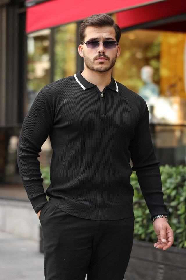 Erkek Yakaları çizgi Detaylı Selanik örme Triko
