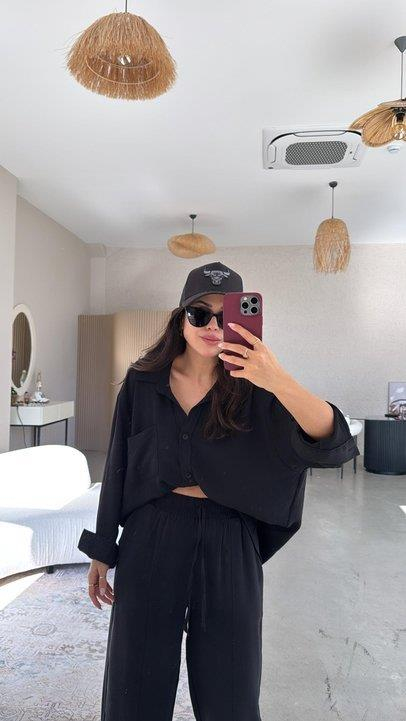 Kadın Flamlı Keten Tek Cep Oversızed Gömlek