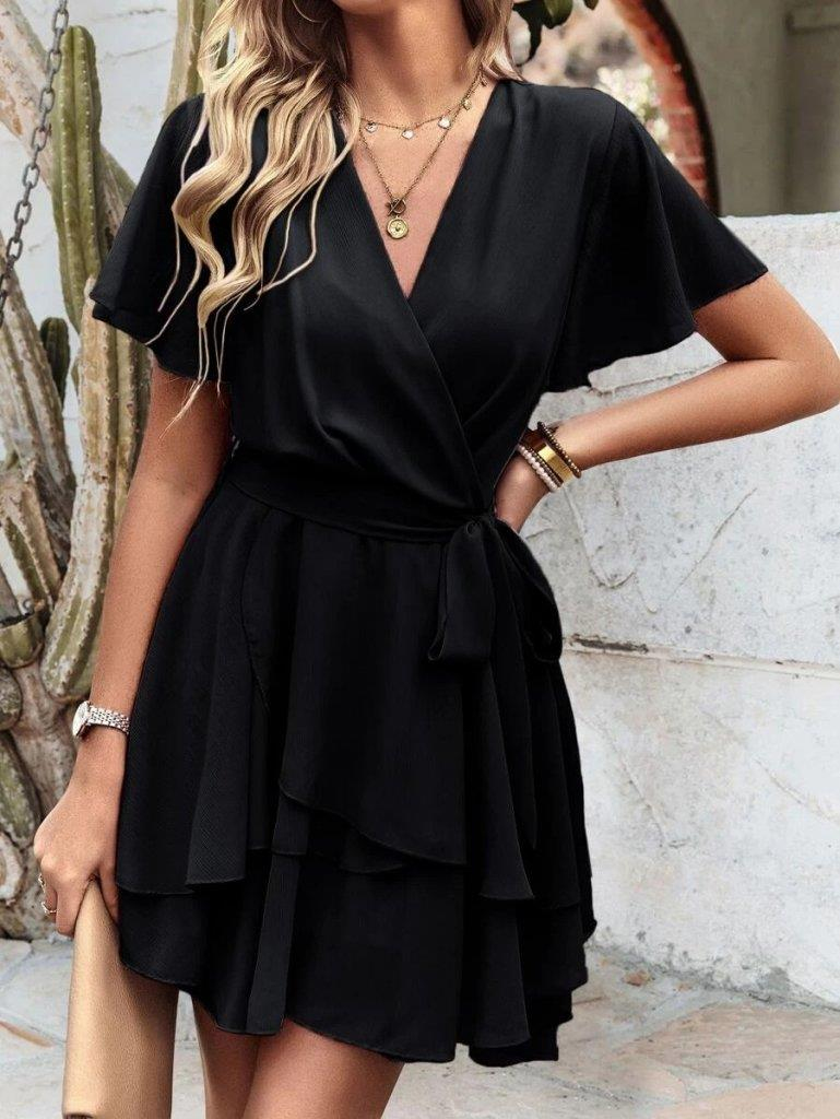 Kadın Kısa Kollu Kruvaze Yaka Belden Kuşaklı Kısa Sandy Elbise