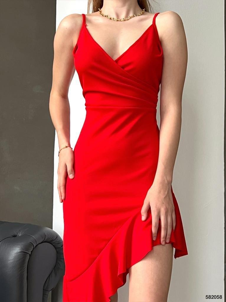 Kadın Omuz Askılı Kruvaze Yaka Asimetrik Kesim Volan Detaylı Elbise