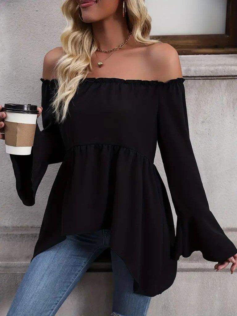 Kadın Uzun Kollu Madonna Yaka Asimetrik Detaylı Kolları Ispanyol Viskon Bluz