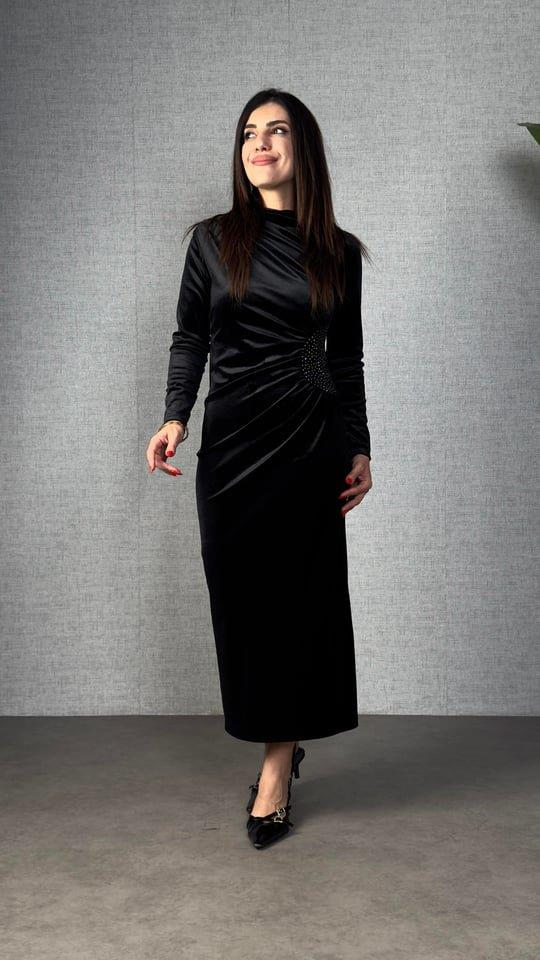 Kadınbalıkçı Yaka Büzgü Ve Taş Işleme Detay Maxi Boy Kadife Elbise